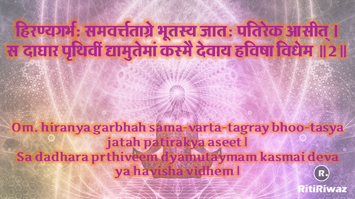 हिरण्यगर्भ: समवर्त्तताग्रे भूतस्य जात: पतिरेक आसीत् । स दाघार पृथिवीं द्यामुतेमां कस्मै देवाय हविषा विधेम ॥२॥