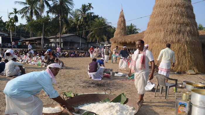 Menfolk, more particularly young men go to the field, preferably near a river, build a makeshift cottage called Bhelaghar that is made of hay from the harvest fields. During the night of the festival, they gather near Bhelaghar and prepare food for the community feast. They eat ‘bhaat’ with ‘dal’ (lentils), with ‘masor jul’ (fish curry), with ‘mangso’ (meat curry) or ‘xaak’ and ‘bhaji’ (herbs and vegetables). The food is mostly non-spicy and is usually prepared in earthenware. They exchange greetings sweets to celebrate the festival. The entire Uruka night is spent around a Meji where people perform Bihu dance, sing Bihu songs with dhol beating, and play games.
