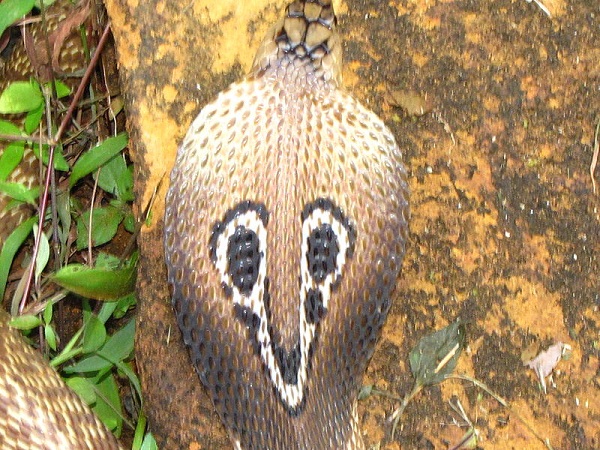 Indian Cobra varies in color and can be grey, yellow, tan, brown, reddish, or black. It has a larger head and a more narrow hood and the key in identifying them is the presence of a pair of large scale, occipitals, located at the back of the top head, and are a unique feature of a king cobra.