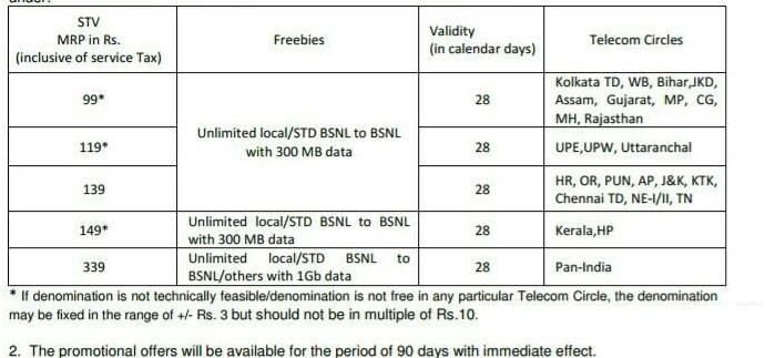 According to the new plan, there is unlimited local/STD BSNL to BSNL with 300 MB data and is of Rs 99 in Kolkata TD, Bihar, Assam, Gujrat, Madhya Pradesh, Chhattisgarh, Maharashtra, Jharkhand, Rajasthan for other circles the same offer will vary from Rs 119 to Rs 149 and this promotional offer is applicable with immediate effects.